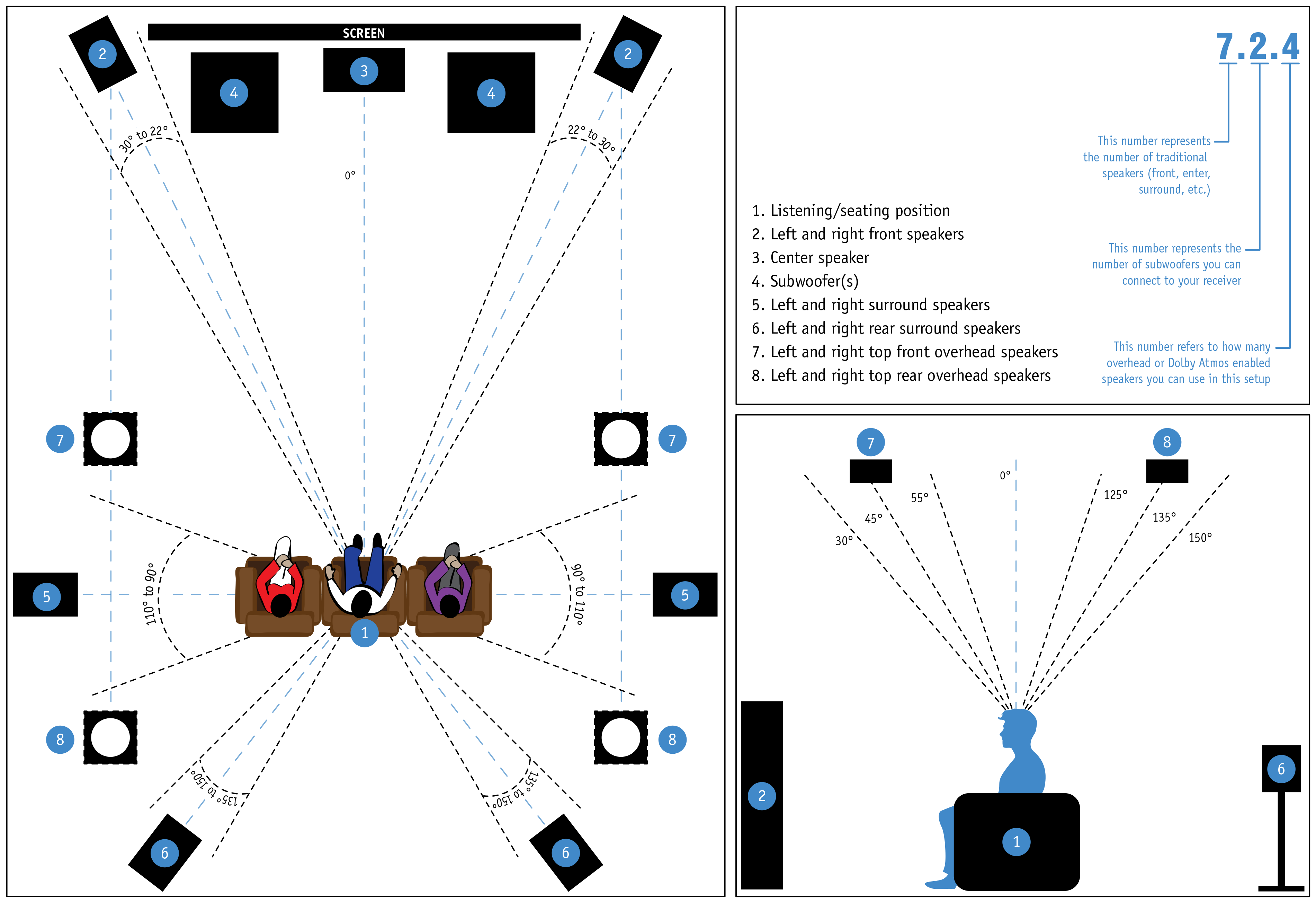 Tornando al Dolby Atmos, illustriamo di seguito come poterlo utilizzare al meglio, in modo da esaltarne le qualità e renderlo il più possibile godibile. Il miglior posizionamento, consigliato dalla stessaDolby Laboratories, è quello riportato nell’immagine qui sotto, di cui potete trovare un esempio fedelmente riprodotto nella nostra salahome cinemademo, presso lo showroomElysium a Busto Arsizio (VA).